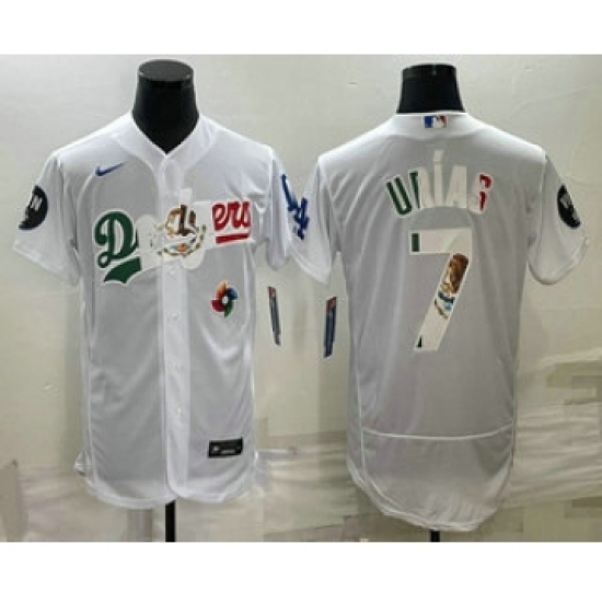 >Men's Los Angeles Dodgers #7 Julio Urias White With Vin Scully Flex Base Stitched Baseball Jersey