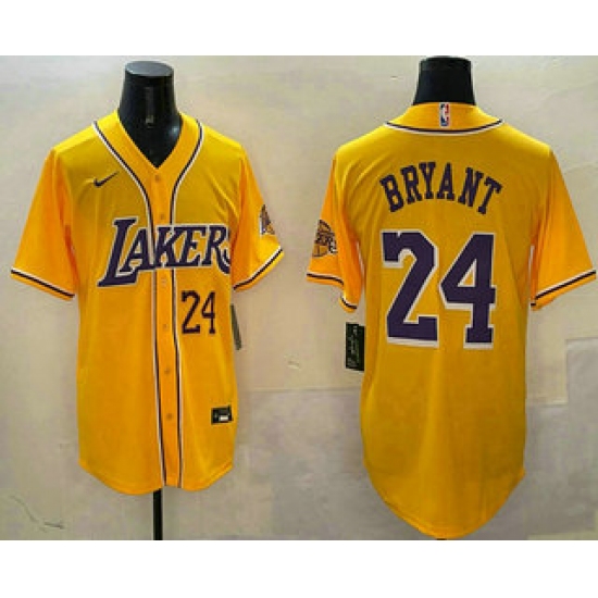 Men's Los Angeles Lakers #24 Kobe Bryant Number Yellow Purple With Cool Base Stitched Baseball Jersey