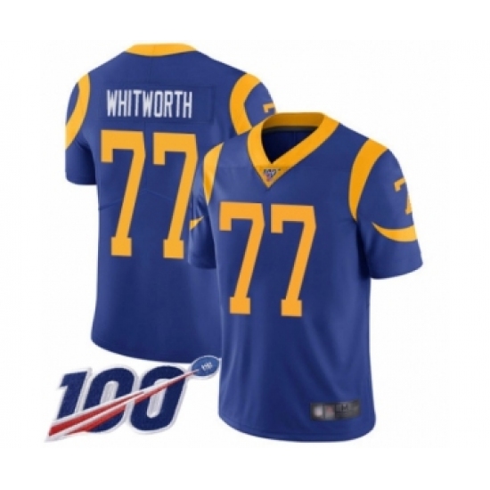 >Men's Los Angeles Rams #77 Andrew Whitworth Royal Blue Alternate Vapor Untouchable Limited Player 100th Season Football Jersey