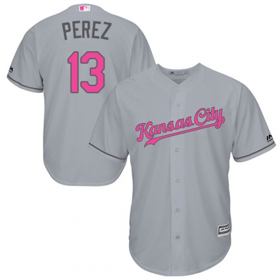 Home>MLB>Kansas City Royals>Salvador Perez>Men's Majestic Kansas City Royals #13 Salvador Perez Replica Grey 2016 Mother's Day Cool Base MLB Jersey