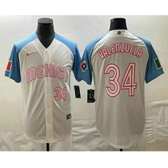 >Men's Mexico Baseball #34 Fernando Valenzuela Number 2023 White Blue World Classic Stitched Jersey1