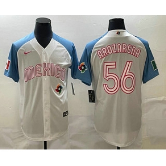 Men's Mexico Baseball #56 Randy Arozarena 2023 White Blue World Classic Stitched Jersey
