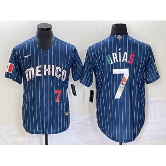 Men's Mexico Baseball #7 Julio Urias 2023 Navy Blue Pinstripe World Baseball Classic Stitched Jersey