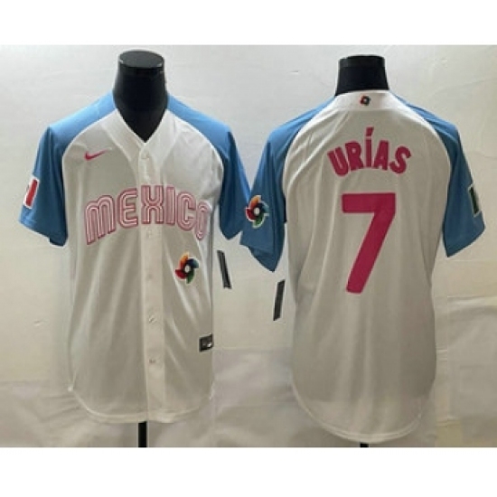 Men's Mexico Baseball #7 Julio Urias 2023 White Blue World Classic Stitched Jersey