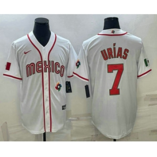 >Men's Mexico Baseball #7 Julio Urias 2023 White World Baseball Classic Stitched Jerseys