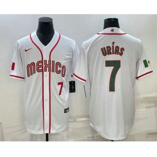 >Men's Mexico Baseball #7 Julio Urias Number 2023 White Blue World Baseball Classic Stitched Jersey1