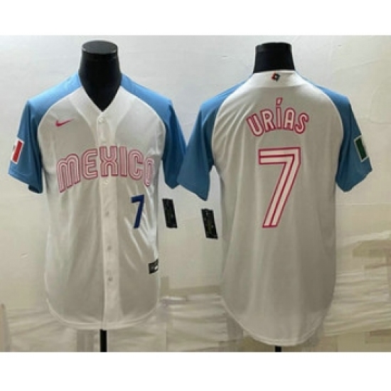 >Men's Mexico Baseball #7 Julio Urias Number 2023 White Blue World Classic Stitched Jersey3