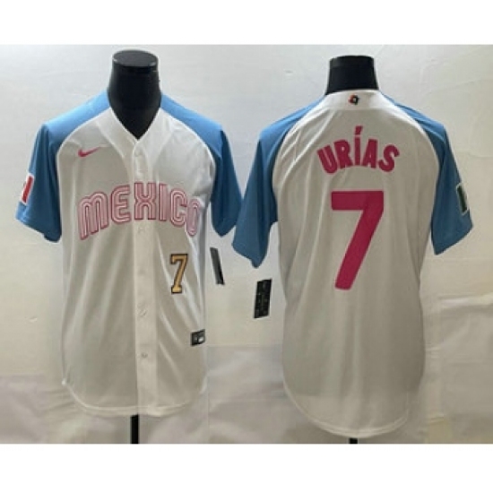 >Men's Mexico Baseball #7 Julio Urias Number 2023 White Blue World Classic Stitched Jerseys