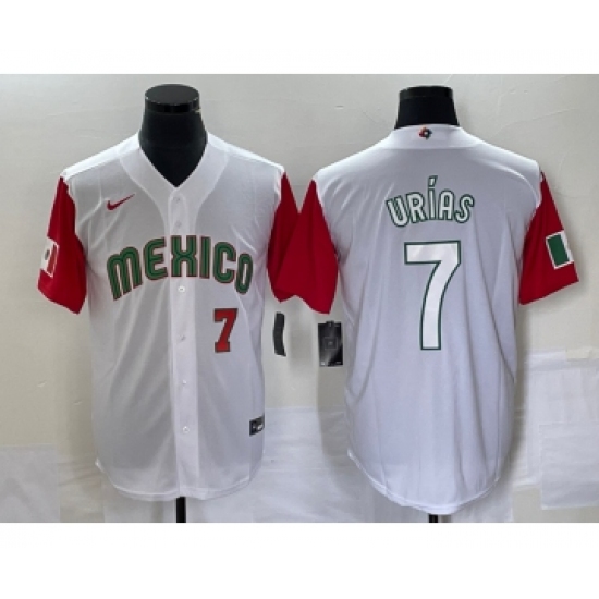 >Men's Mexico Baseball #7 Julio Urias Number 2023 White Red World Classic Stitched Jersey 35