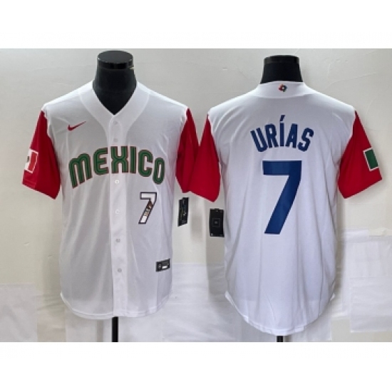 >Men's Mexico Baseball #7 Julio Urias Number 2023 White Red World Classic Stitched Jersey