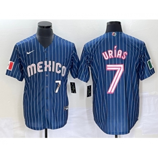 >Men's Mexico Baseball #7 Julio Urias Number Navy Blue Pinstripe 2020 World Series Cool Base Nike Jersey