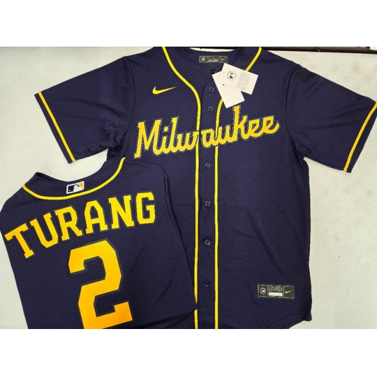 >Men's Milwaukee Brewers #2 Brice Turang Navy Blue Stitched MLB Cool Base Nike Jersey