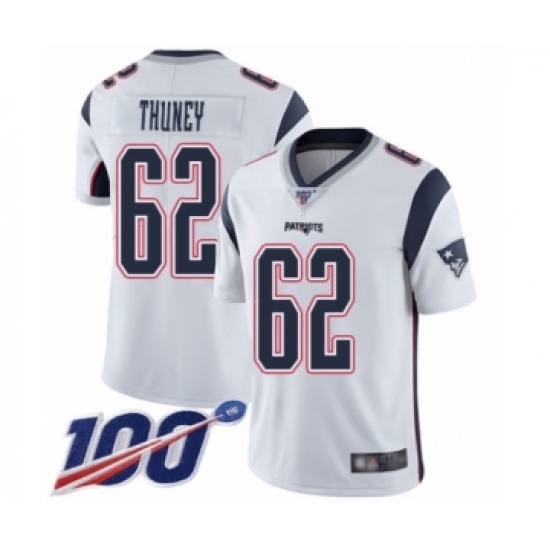 >Men's New England Patriots #62 Joe Thuney White Vapor Untouchable Limited Player 100th Season Football Jersey