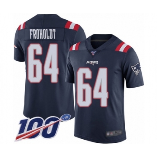 >Men's New England Patriots #64 Hjalte Froholdt Limited Navy Blue Rush Vapor Untouchable 100th Season Football Jersey