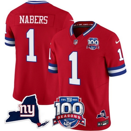 >Men's New York Giants 1 Malik Nabers Red 2024 F U S E 100th Season And State Vapor Limited Stitched Football Jersey