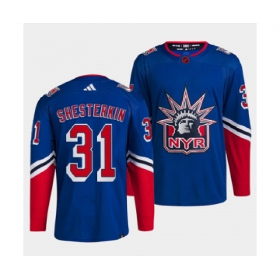 >Men's New York Rangers #31 Igor Shesterkin Blue 2022 Reverse Retro Stitched Jersey