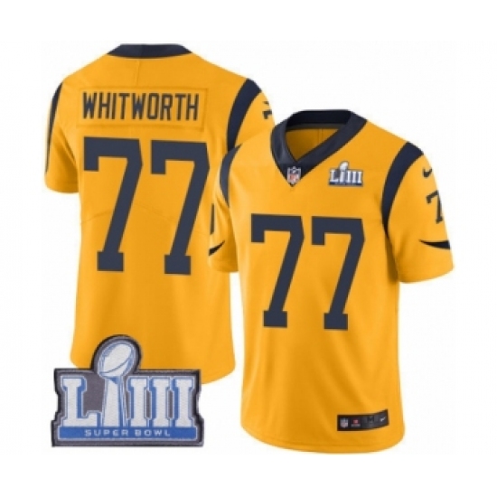 >Men's Nike Los Angeles Rams #77 Andrew Whitworth Limited Gold Rush Vapor Untouchable Super Bowl LIII Bound NFL Jersey