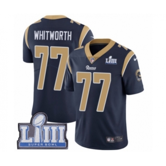 >Men's Nike Los Angeles Rams #77 Andrew Whitworth Navy Blue Team Color Vapor Untouchable Limited Player Super Bowl LIII Bound NFL Jersey