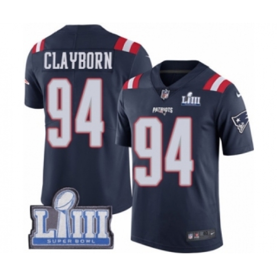 Men's Nike New England Patriots #94 Adrian Clayborn Limited Navy Blue Rush Vapor Untouchable Super Bowl LIII Bound NFL Jersey