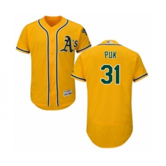 >Men's Oakland Athletics #31 A.J. Puk Gold Alternate Flex Base Authentic Collection Baseball Player Jersey