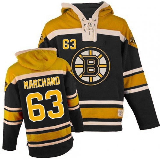 Home>NHL>Boston Bruins>Brad Marchand>Men's Old Time Hockey Boston Bruins #63 Brad Marchand Authentic Black Sawyer Hooded Sweatshirt NHL Jersey