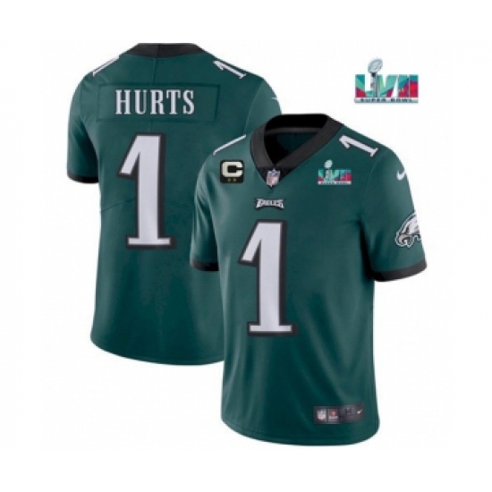 >Men's Philadelphia Eagles #1 Jalen Hurts Green Super Bowl LVII Patch And 2-star C Patch Vapor Untouchable Limited Stitched Jersey