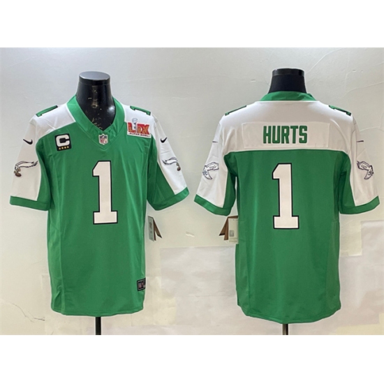 Men's Philadelphia Eagles #1 Jalen Hurts Green White 2025 Super Bowl LIX And 4-Star C F.U.S.E. Vapor Untouchable Limited Football Stitched Jersey