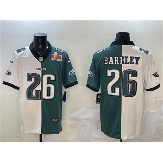 >Men's Philadelphia Eagles #26 Saquon Barkley White & Green Split 2025 Super Bowl LIX Vapor Untouchable Limited Football Stitched Jersey
