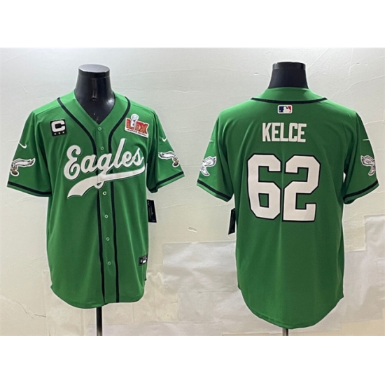 Men's Philadelphia Eagles #62 Jason Kelce Green 2025 Super Bowl LIX And 3-Star C Stitched Baseball Jersey