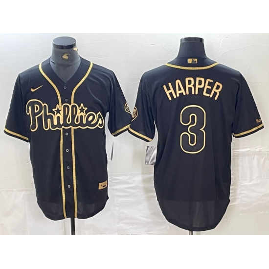 Men's Philadelphia Phillies #3 Bryce Harper Black Gold Cool Base Stitched Baseball Jersey