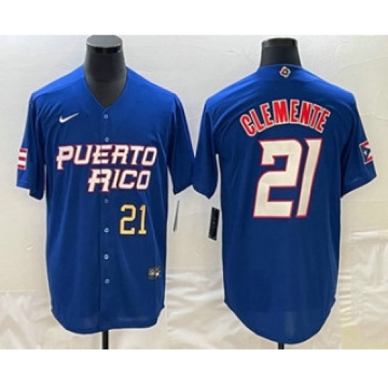 >Mens Puerto Rico Baseball #21 Roberto Clemente Number 2023 Blue World Classic Stitched Jersey