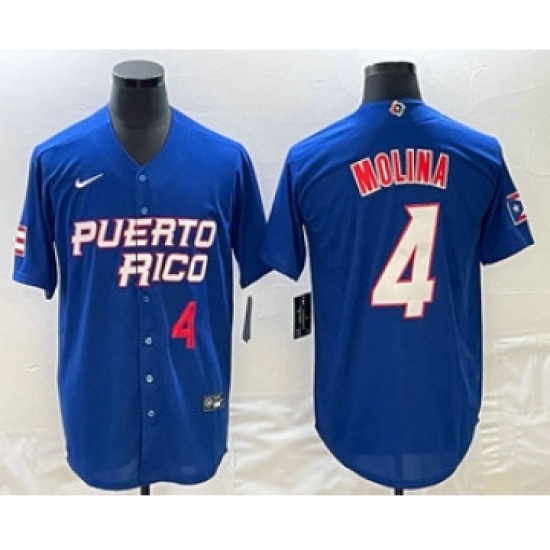 >Men's Puerto Rico Baseball #4 Yadier Molina Number 2023 Blue World Baseball Classic Stitched Jersey