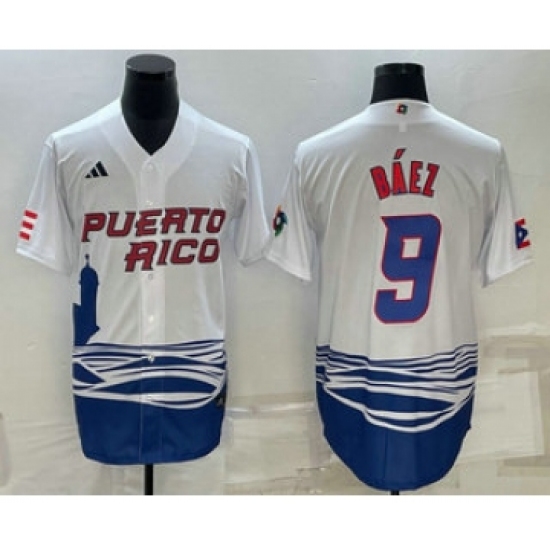 Men's Puerto Rico Baseball #9 Javier Baez White 2023 World Baseball Classic Stitched Jersey