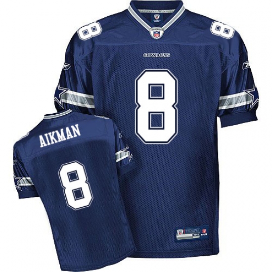 Feel like part of your favorite team by wearing this NFL® Men's Reebok Dallas Cowboys #8 Troy Aikman Authentic Navy Blue Team Color Throwback NFL Jersey, made of thick, high-quality Pro-Brite fabric for a genuine gridiron look. The players number which 100% stitched is displayed in tackle twill on the chest, back and sleeves, along with the team name on the front. The players name which 100% stitched is displayed on a sewn-down nameplate at the back. 100% Pro-Brite nylon and 100% Pro-Brite polyester for body, 100% lycratalic spandex dazzle for Side Panels/Collar/Cuffs, NFL® Equipment patch sewn on the bottom of the front collar or fabric insert, NFL® Equipment jock tag with numeric sizing is applied to the lower left bottom of the jersey, Reebok® logo embroidered on each sleeve, Officially licensed.