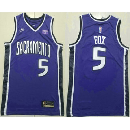 >Men's Sacramento Kings #5 DeAaron Fox Purple 2024 City Edition Swingman Sponsor Stitched Jersey