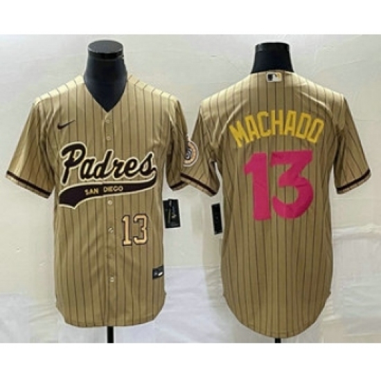 Men's San Diego Padres #13 Manny Machado Tan Pinstripe 2023 City Connect Cool Base Stitched Jersey