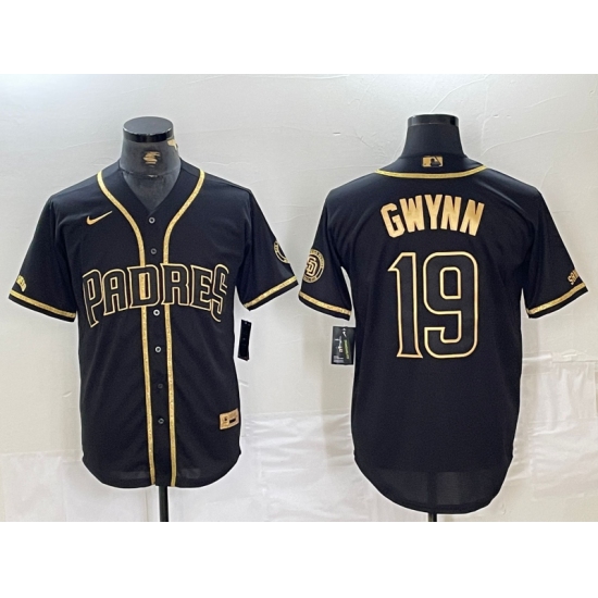 >Men's San Diego Padres #19 Tony Gwynn Black Gold Cool Base Jersey