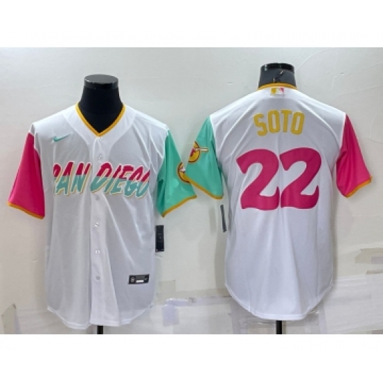 >Men's San Diego Padres #22 Juan Soto White 2022 City Connect Cool Base Stitched Jersey