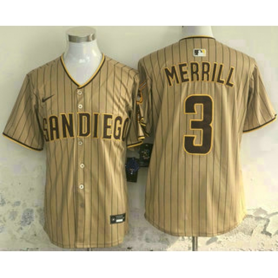 >Men's San Diego Padres #3 Jackson Merrill Khaki Pinstripe Limited Stitched Jersey