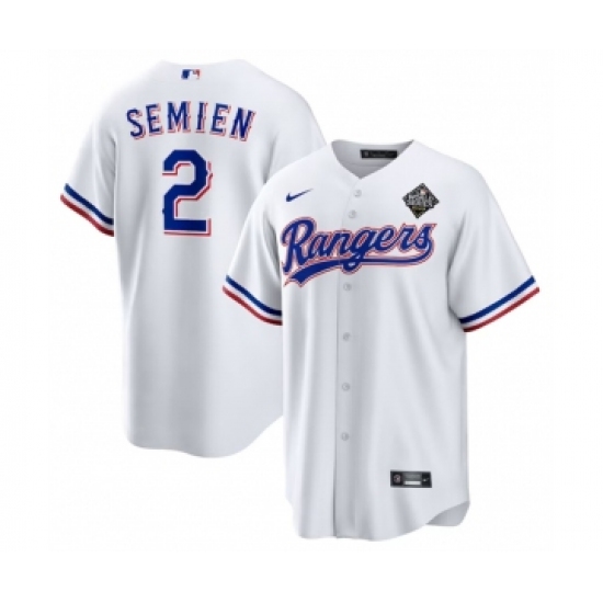 Men's Texas Rangers #2 Marcus Semien 2023 White World Series Stitched Baseball Jersey