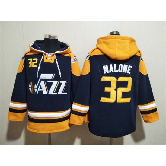>Men's Utah Jazz #32 Karl Malone Navy Yellow Lace-Up Pullover Hoodie