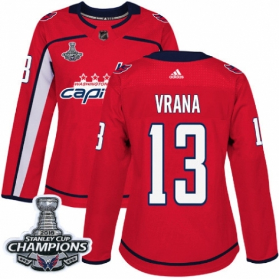 Women's Adidas Washington Capitals #13 Jakub Vrana Authentic Red Home 2018 Stanley Cup Final Champions NHL Jersey