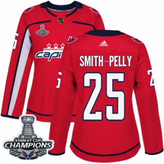 >Women's Adidas Washington Capitals #25 Devante Smith-Pelly Authentic Red Home 2018 Stanley Cup Final Champions NHL Jersey