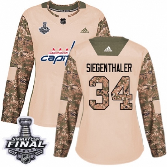 >Women's Adidas Washington Capitals #34 Jonas Siegenthaler Authentic Camo Veterans Day Practice 2018 Stanley Cup Final NHL Jersey