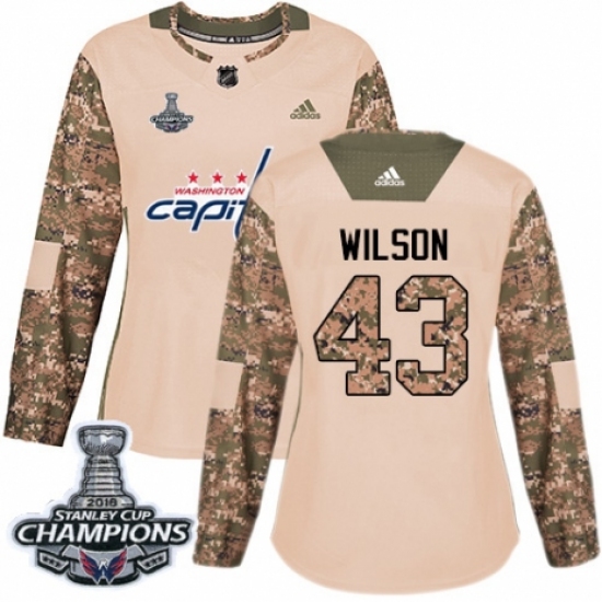 Women's Adidas Washington Capitals #43 Tom Wilson Authentic Camo Veterans Day Practice 2018 Stanley Cup Final Champions NHL Jersey