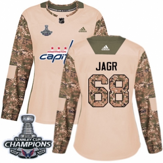 >Women's Adidas Washington Capitals #68 Jaromir Jagr Authentic Camo Veterans Day Practice 2018 Stanley Cup Final Champions NHL Jersey