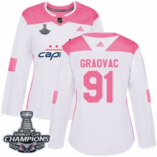 Women's Adidas Washington Capitals #91 Tyler Graovac Authentic White Pink Fashion 2018 Stanley Cup Final Champions NHL Jersey