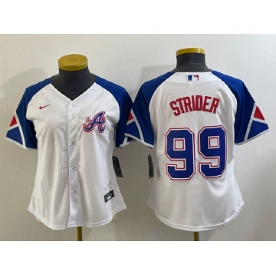 >Women's Atlanta Braves #99 Spencer Strider White 2023 City Connect Cool Base Stitched Jersey
