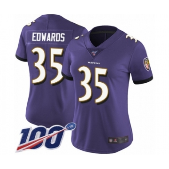 >Women's Baltimore Ravens #35 Gus Edwards Purple Team Color Vapor Untouchable Limited Player 100th Season Football Jersey