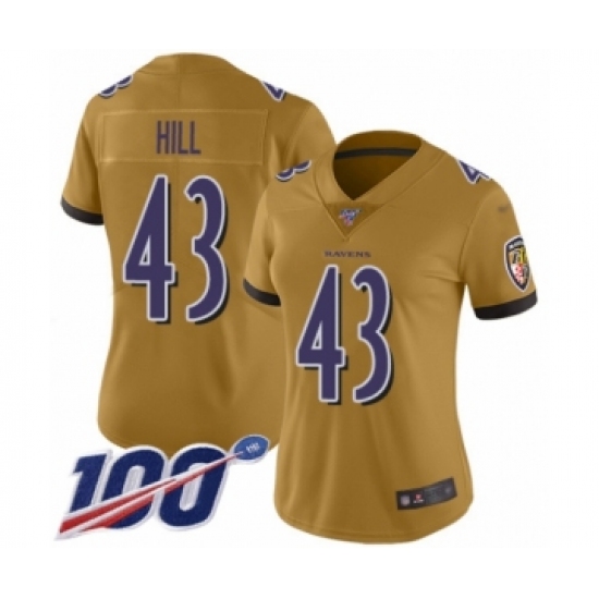 Women's Baltimore Ravens #43 Justice Hill Limited Gold Inverted Legend 100th Season Football Jersey